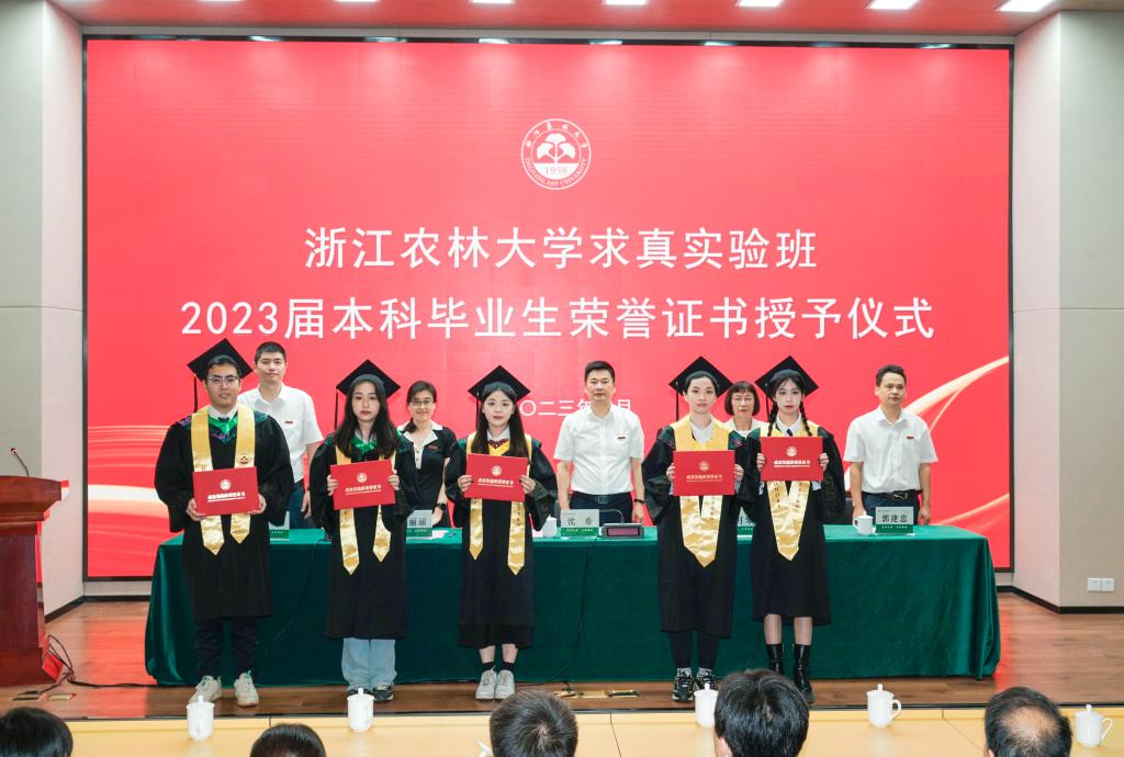 6月16日下午,浙江農林大學求真實驗班2023屆本科畢業生榮譽證書授予儀式在學三國際報告廳舉行。校長沈希教授、副校長沈月琴教授出席儀式。