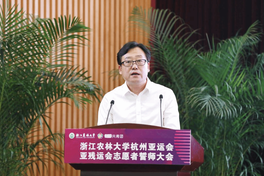 朱斌對我校826名亞運會志愿者及志愿者領隊教師表示敬意,向一直以來關心支持我校亞運志愿服務工作的臨安團隊以及廣大師生表示衷心的感謝。朱斌指出,杭州亞運會是黨的二十大勝利召開后舉辦的一場國際綜合性體育文化盛會,高質量服務杭州亞運,有力彰顯護航亞運的高校擔當,浙江農林大學責無旁貸、浙江農林大學志愿者們使命光榮。