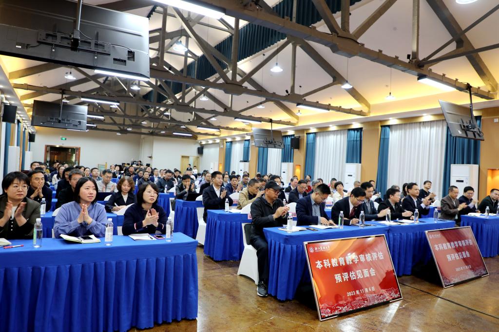 沈月琴從歷史沿革、基本信息、學院設置、學科專業、人才隊伍和教學科研平臺等方面介紹了學校概況。她介紹了學校圍繞“一流本科”建設,在立德樹人、一流專業課程體系建設、師資隊伍建設、教育教學資源數字化建設、產教深度融合發展、體制機制創新等方面開展的一系列本科教育教學改革工作,并針對預評估的籌備和落實進行了簡要說明。
