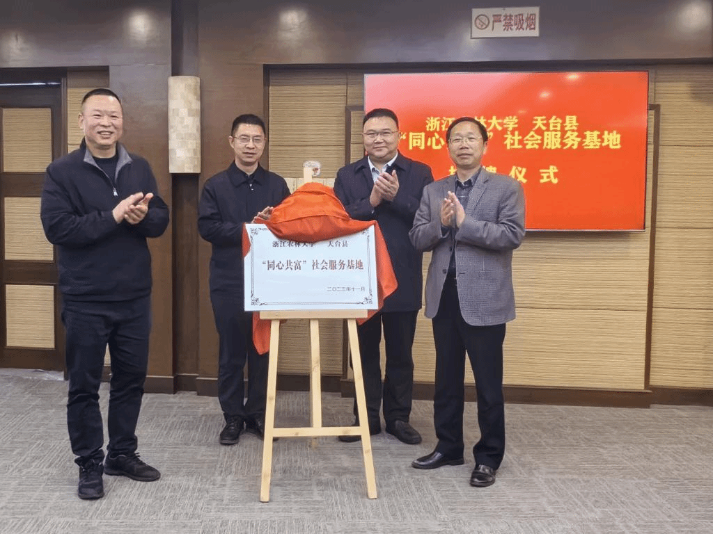座談會期間,舉行了浙江農林大學和天臺縣“同心共富”社會服務基地揭牌儀式。朱斌、李昌明共同見證,馮尚申、陳石秀共同揭牌。