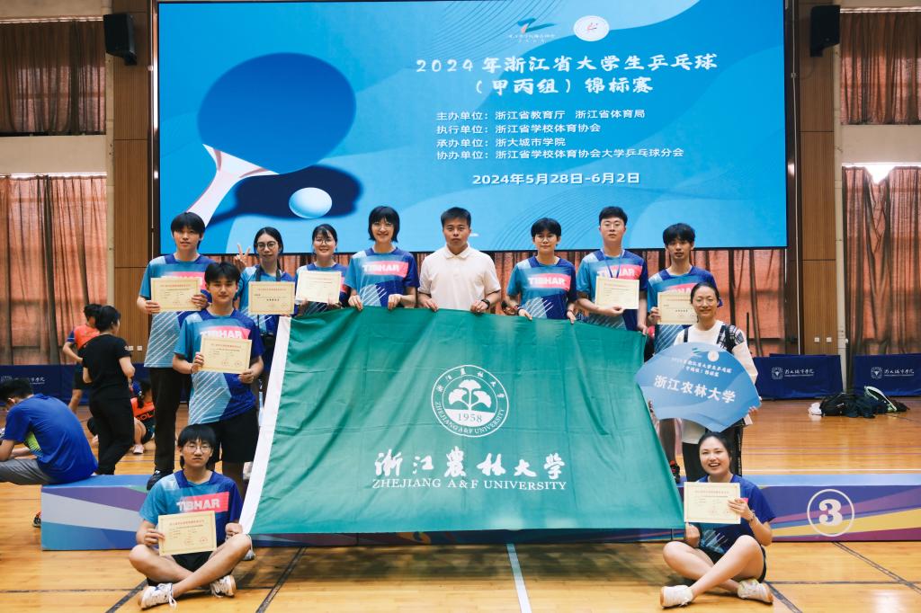 6月2日,2024年浙江省大學生乒乓球(甲丙組)錦標賽在杭州落下帷幕。經過6天的激烈角逐,我校代表隊經過奮勇拼搏,繼蟬聯了兩屆混雙冠軍后再次摘得甲組女子雙打冠軍的好成績,實現了學校在該賽事上的新突破。充分體現了我校深入踐行“無體藝 不農林”理念取得的育人成效。
