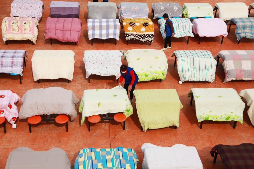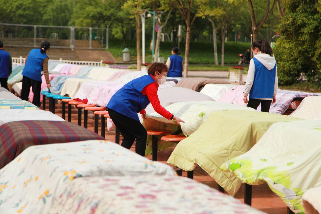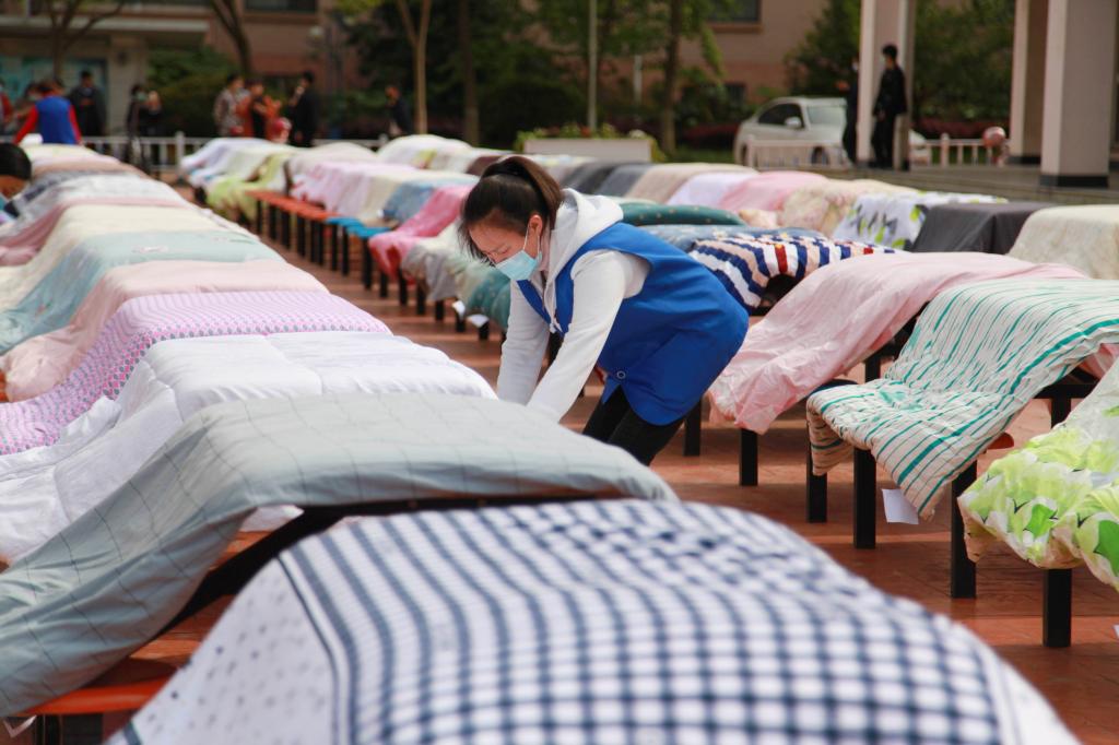 4月21日,學校公布了開學返校時間。為迎接學生返校,學校后勤集團組織黨員志愿者、宿管阿姨等幫學生曬被子。有曬被子需求的學生,可通過微信群等平臺聯系所在公寓的宿管阿姨,黨員志愿者、阿姨們則會根據學生預約需求,給每條被子做好標記,結合天氣情況進行晾曬。