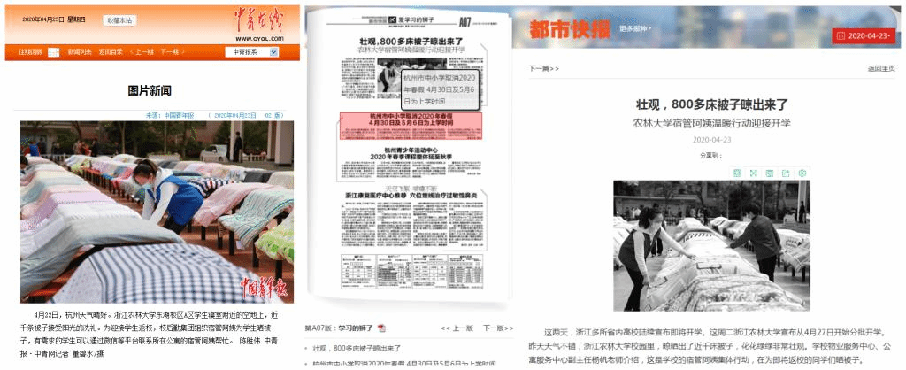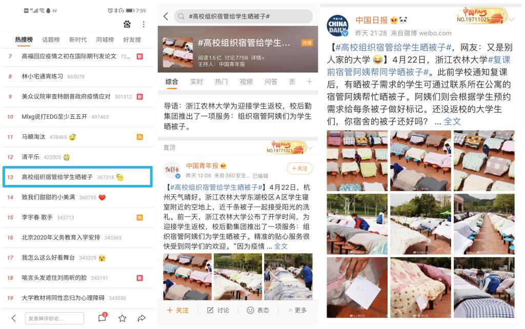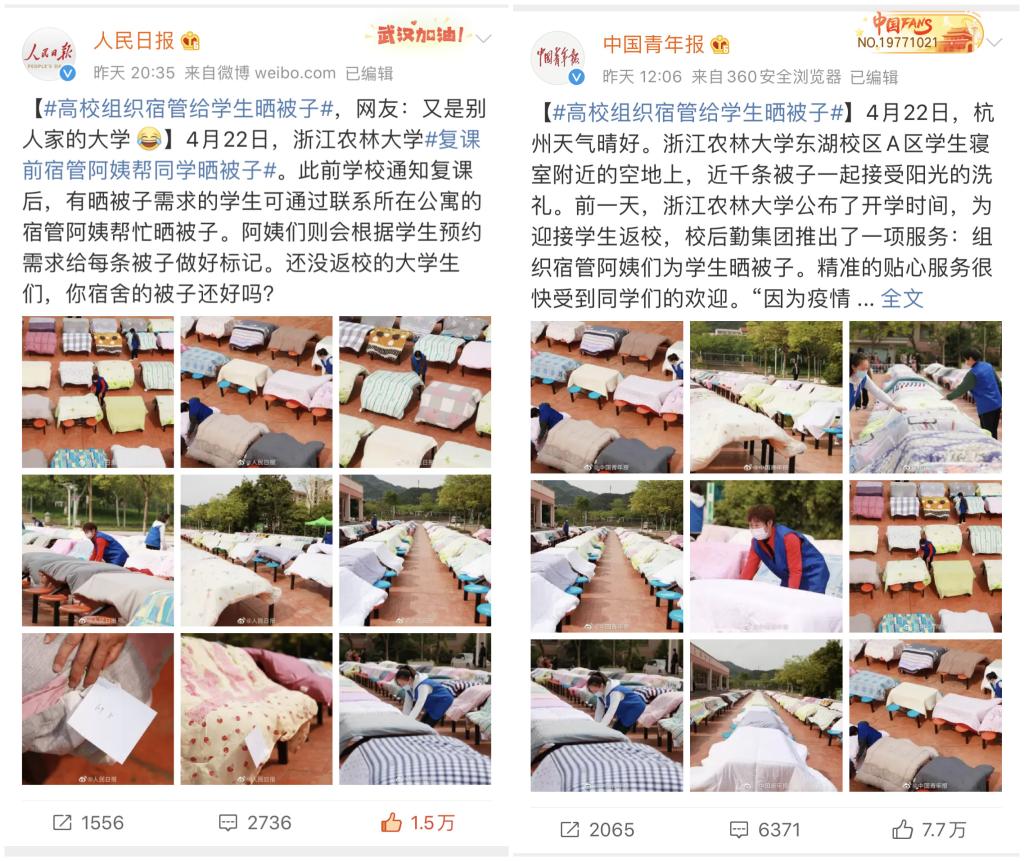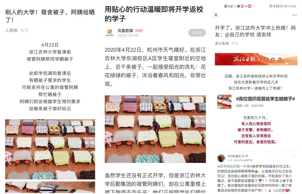 相關媒體紛紛以“貼心曬被”“別人的大學,寢室里的被子,阿姨給曬了!”“用貼心的行動溫暖即將開學返校的學子”“壯觀,杭州這所學校曬了800多床被子!背后的故事和陽光一樣暖”“杭州:大學宿管阿姨給學生曬好被子迎開學”等為題,紛紛關注報道我校踐行育人初心、服務學生需求的這一貼心服務、暖心舉措……同時,“高校組織宿管給學生曬被子”的話題還登上微博熱搜,被“人民日報”、“中國青年報”、“中國日報”等官方微博點贊,獲得網友高度支持,家長及學生們豎起大拇指連聲夸贊:學校太貼心了!我的孩子就要報考這樣的大學。
