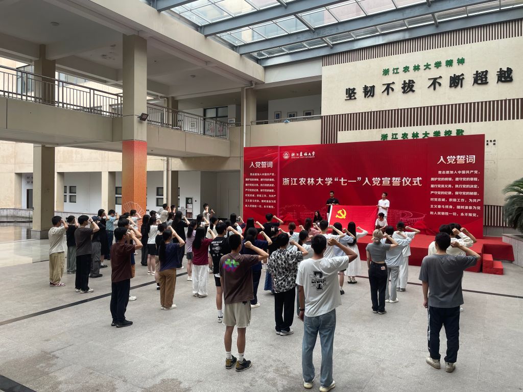 在活動中心校歌墻前,汪和生對新發展的黨員同志表示祝賀,并為新發展黨員贈送了“黨員五寶”。全體黨員面向黨旗,高舉右拳,在莊嚴的誓詞中進一步堅定了跟黨走的初心。宣誓儀式后全體黨員集體參觀了校史館,共同重溫學校艱苦創業、跨越發展的辦學歷程和發展成就,感悟浙農林大人堅韌如磐、一往無前的品格氣質,在校史中汲取精神力量。