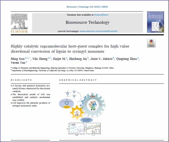 近日,化學(xué)與材料學(xué)院郭明教授團(tuán)隊在國際農(nóng)林領(lǐng)域期刊《Bioresource Technology》(中科院1區(qū)TOP期刊,影響因子11.889)發(fā)表了題為“Highly catalytic supramolecular host-guest complex for high value directional conversion of lignin to syringyl monomer”的論文。該研究構(gòu)建一種酶-介質(zhì)系統(tǒng)對脫堿木質(zhì)素進(jìn)行酶催化降解方法,具有高降解率、高轉(zhuǎn)化率等優(yōu)點。