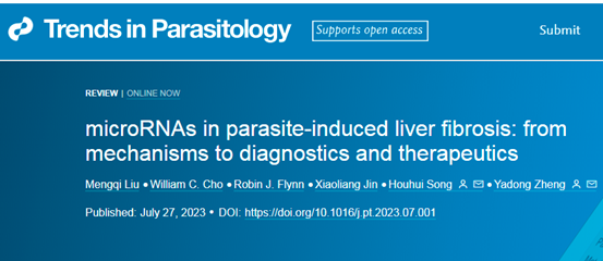 7月27日,動物科技學院·動物醫學院宋厚輝教授團隊在《Cell》旗下寄生蟲學頂級期刊《Trends in Parasitology》(《寄生蟲學趨勢》,中科院1區Top,IF3-year9.714)在線發表了題為《微小RNA與寄生蟲誘導的肝纖維化:從機制到診斷和治療》(MicroRNAs in Parasite-induced Liver Fibrosis: from Mechanisms to Diagnostics and Therapeutics)的論文。