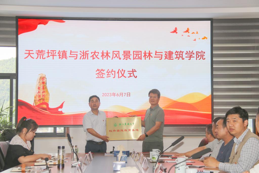 賀苗介紹了天荒坪鎮的整體概況、特色優勢、目前存在的問題及下一步發展方向。趙宏波介紹了學院的基本情況。他表示雙方在美麗鄉村建設、可持續發展產業等多方面契合度高,學院將充分依托學校和學院的科技人才、科研成果和服務地方鄉村建設經驗等優勢,有力服務天荒坪鎮高質量發展。座談會后,陳審聲和賀苗分別代表中共浙江農林大學風景園林與建筑學院委員會與中共安吉縣天荒坪鎮委員會簽訂黨建共建合作協議;趙宏波代表學院出席校外實踐教育基地授牌儀式。