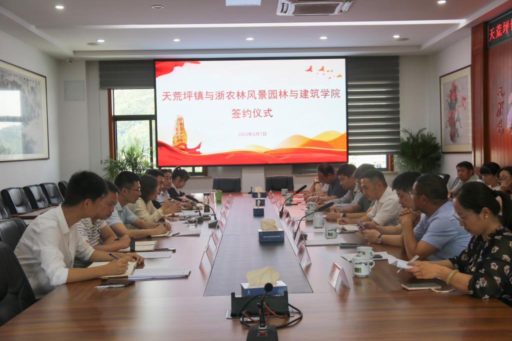 近日,園林學院開展“大走訪大調研大服務大解題”活動, 與安吉縣天荒坪鎮人民政府簽訂黨建共建合作協議,并舉行校外實踐教育基地授牌儀式。園林學院院長趙宏波、黨委書記陳審聲等相關領導,天荒坪鎮黨委書記賀苗、黨委委員及大溪村書記陳軍等參加座談和簽約儀式。