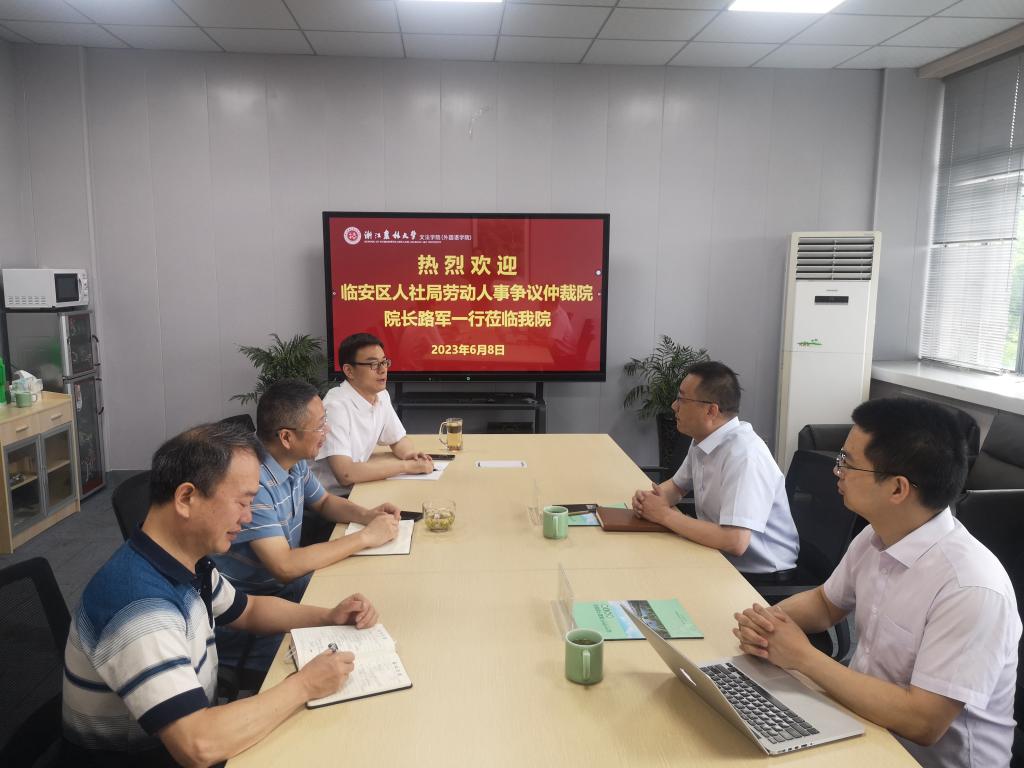 6月8日,臨安區人社局勞動人事爭議仲裁院院長路軍、副院長郝成群到文法學院交流,對接院地合作相關事宜。文法學院院長魯可榮、黨委書記朱紅東等班子成員參加座談。